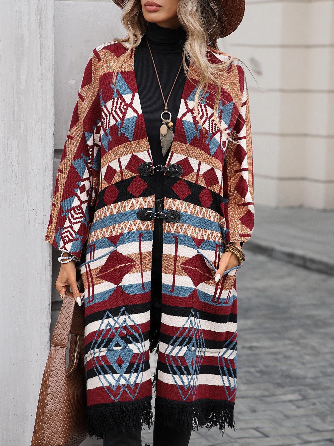 Introducing our Women's Long Button Block Pattern Cardigan Sweater Shawl, a stylish addition to any outfit. Crafted from soft, comfortable fabric, this shawl features a chic square pattern and striped colors, complete with a trendy fringed hem and button closure.